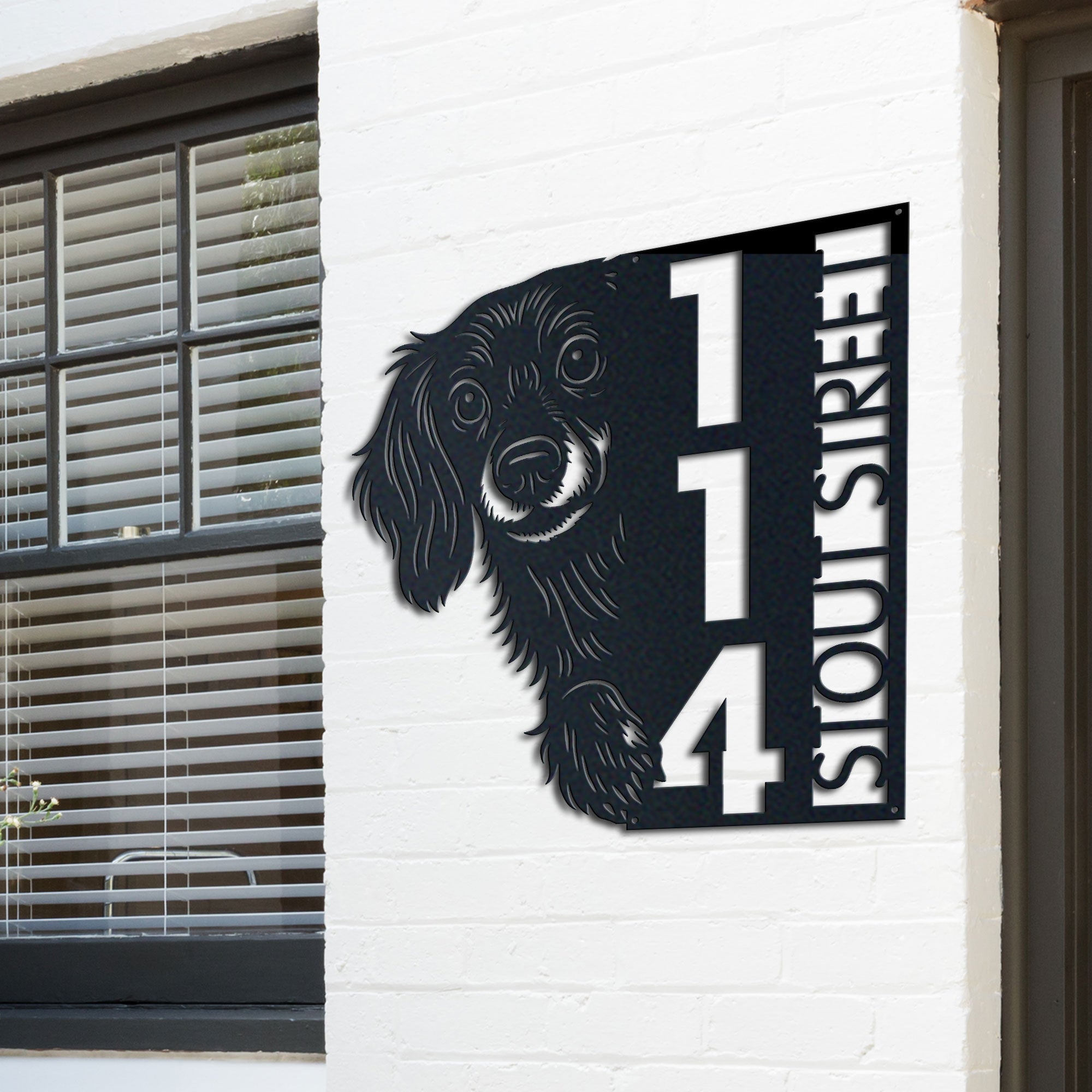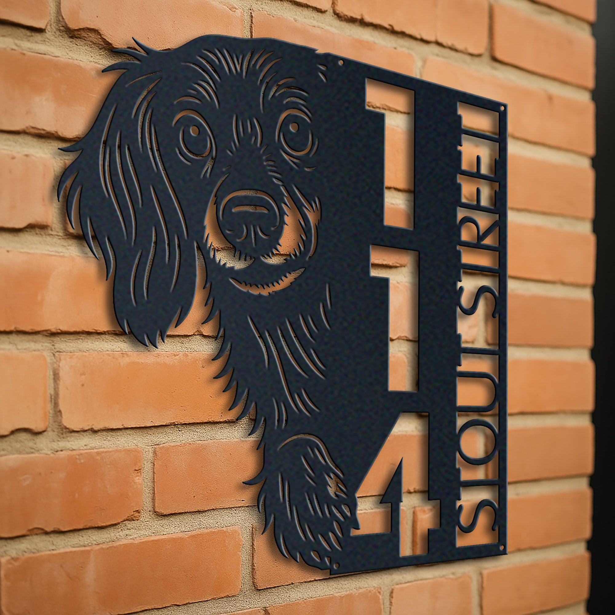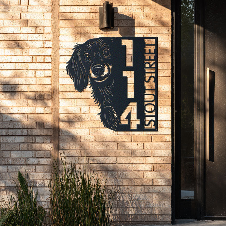 long hair dachshund Address Sign | Custom Metal Vertical House Number Plaque | Pet Owner Gift